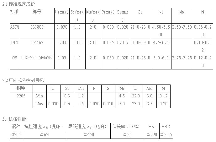 2205 steel belongs to very low carbon two-phase stainless and acid-resistant steel, with good crevice corrosion resistance and electrochemical corrosion characteristics. At the same time, nitrogen is very strong in producing long-term stable martensite elements. Even after electric welding or heating, it can ensure that there is a certain amount of martensite in the system, and it is not easy to produce single-phase electrical metallographic structure. The second phase ratio is less sensitive to the change of heating ambient temperature.