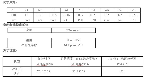 * Very good corrosion resistance and heat resistance, good physical properties at sub-zero, indoor temperature and 600 ℃ high temperature environment, very good oxidation resistance, recovery, nitriding characteristics, easy process performance.