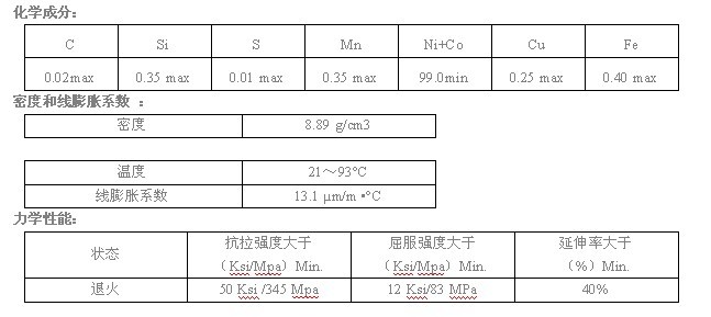 * Compared with N02200, it is more suitable for application in places where the temperature is higher than 600 ° F (315 ° C), and has excellent corrosion resistance characteristics.